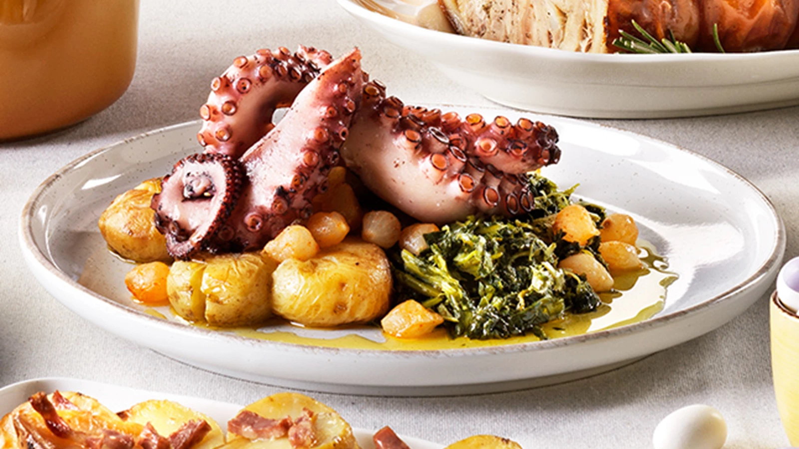 O Polvo à Lagareiro — com batatas, cebolinhas e grelos salteados — é uma das sugestões imperdíveis do chef André para o almoço da Páscoa. Ao servir, regue com um generoso fio de azeite virgem extra aromatizado com alho fresco picado e finalize com salsa picada para realçar os sabores.