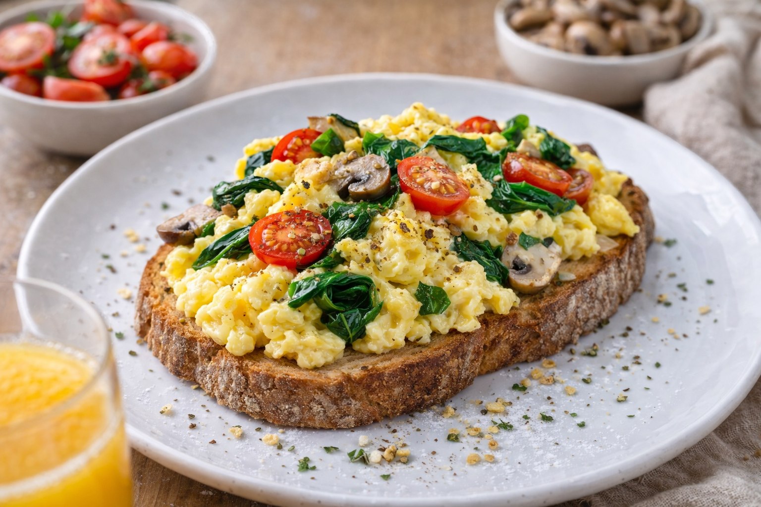 Temos outra sugestão: Tofu mexido com espinafres e cogumelos.