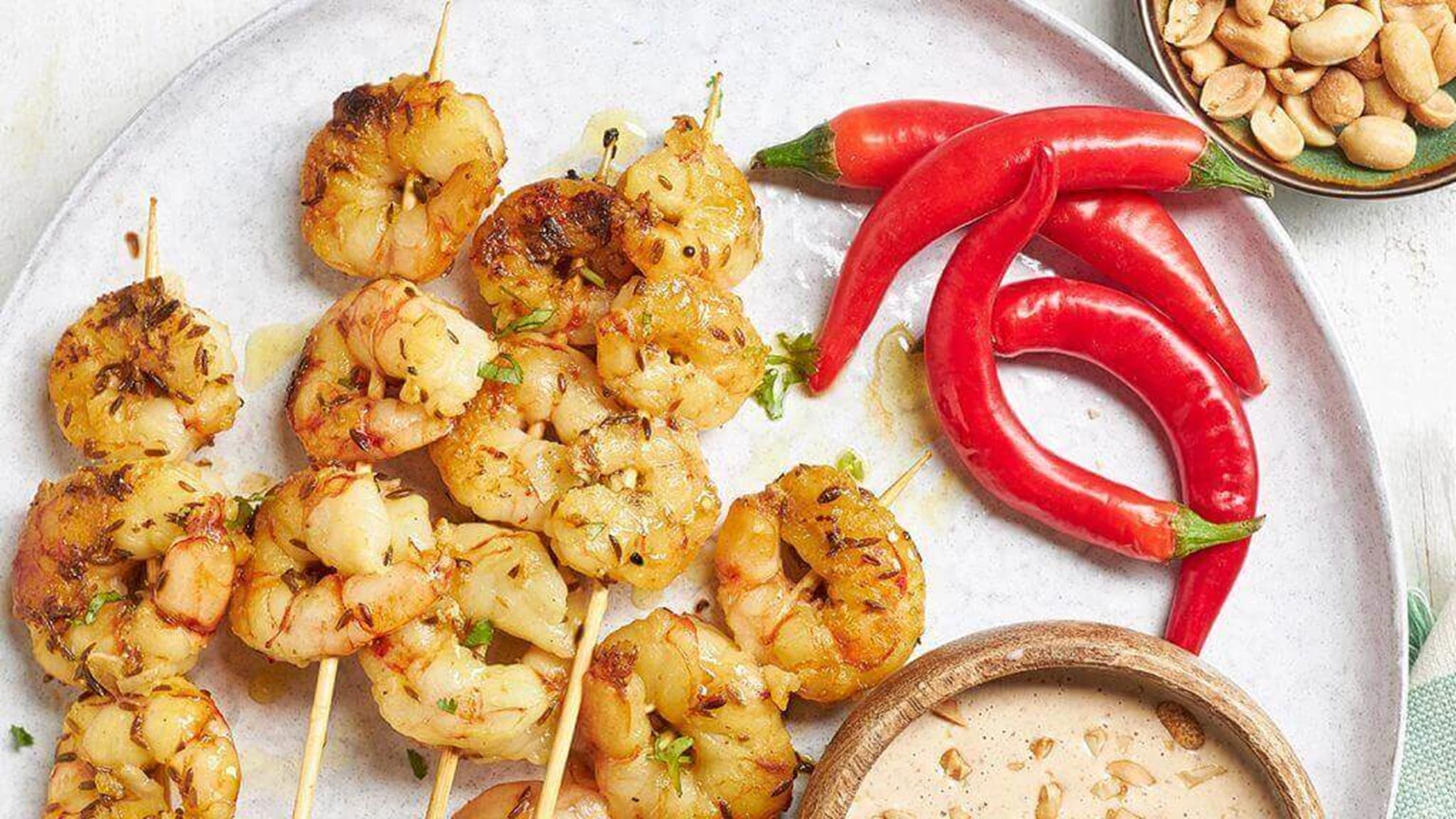 Se gosta de sabores fortes e exóticos, prove estas espetadas de camarão com molho de amendoim. Neste prato une-se o amendoim com a doçura do mel, o leve picante do gengibre e a intensidade da malagueta. Todos estes sabores, misturados num molho cremoso sobre o frescor dos camarões, formam uma receita surpreendente que poderá servir como entrada ou refeição principal.