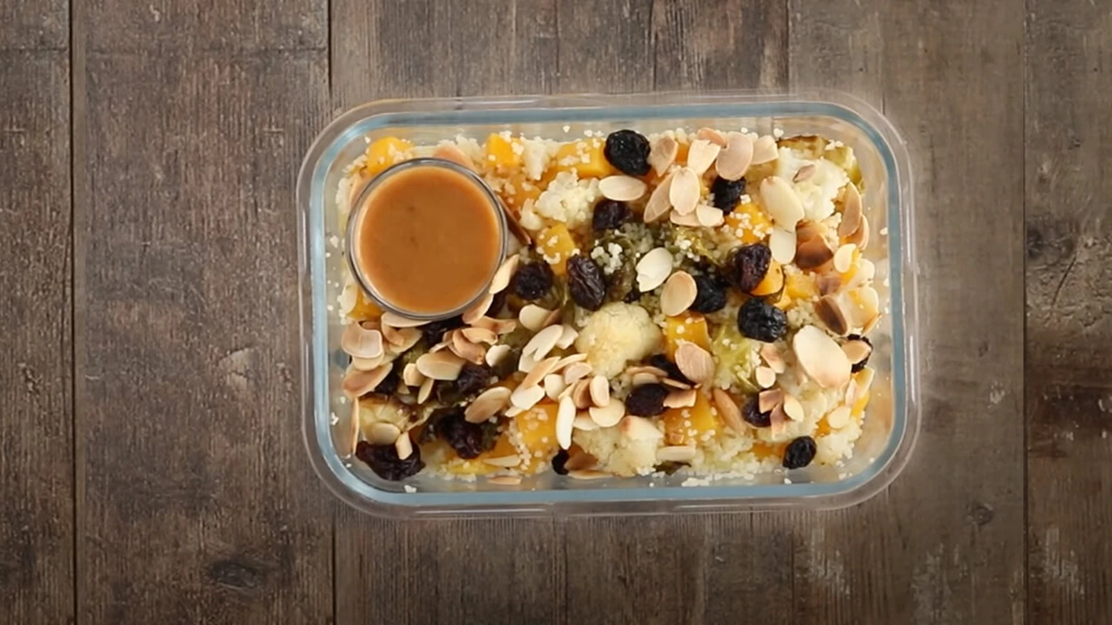4. Coloque o couscous e os legumes assados na marmita e envolva bem com as mãos.