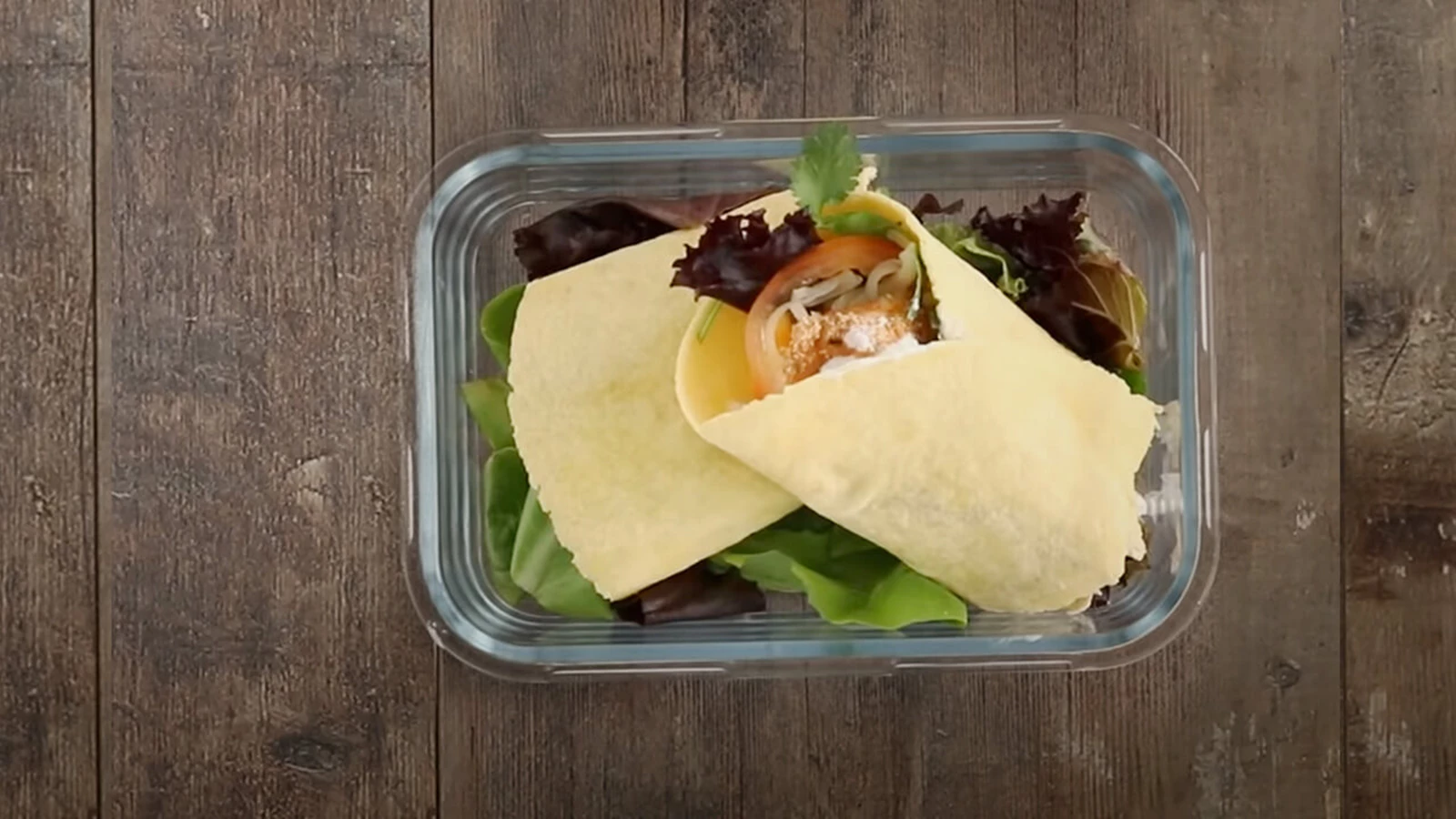 5. Para o wrap, coloque a mistura de alfaces por cima da tortilha, disponha o tomate, o peru, o queijo ralado e termine com o molho de iogurte. Enrole e coloque na marmita.
