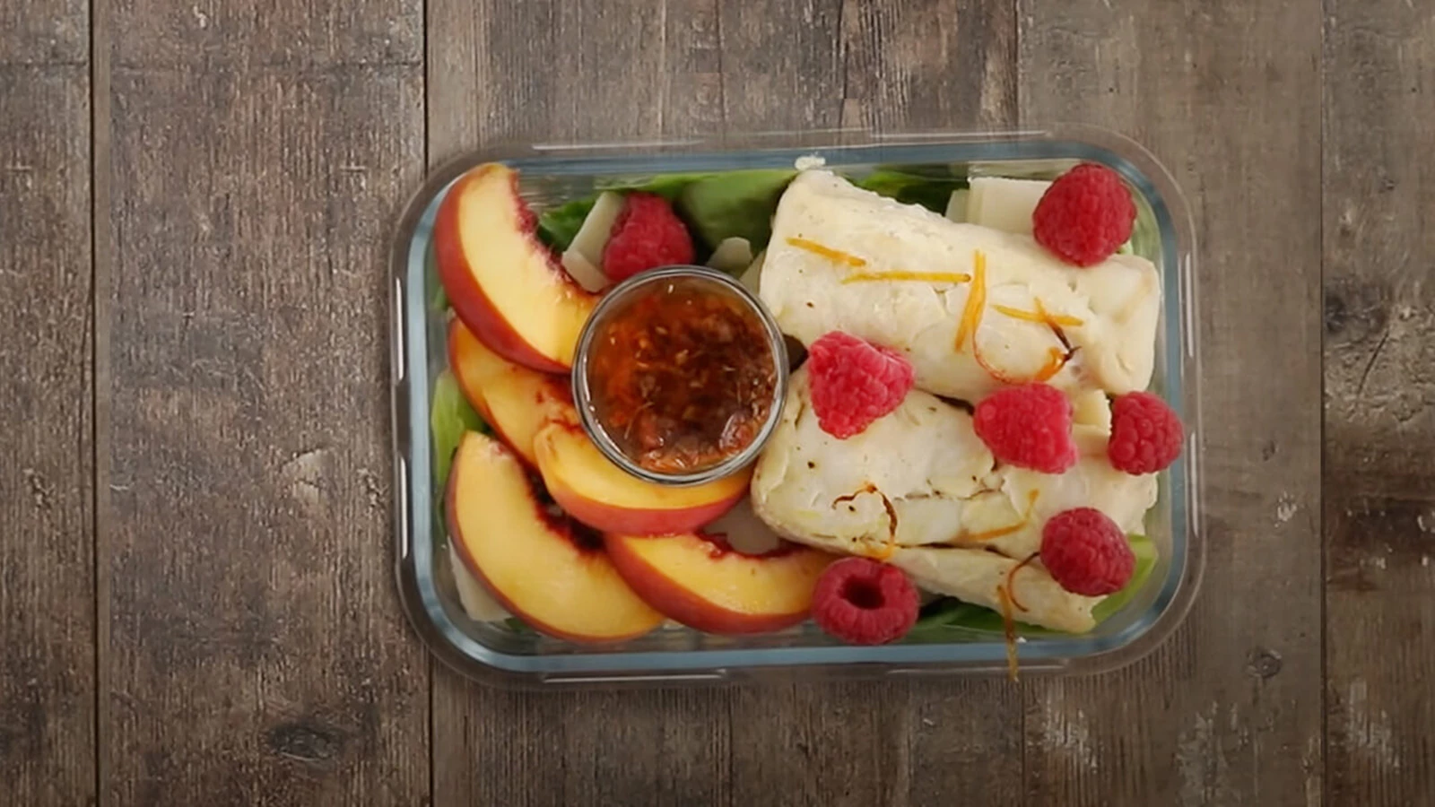 5. Disponha o queijo parmesão por cima, os gomos de pêssego, a pescada e as framboesas e junte uma taça com o molho.