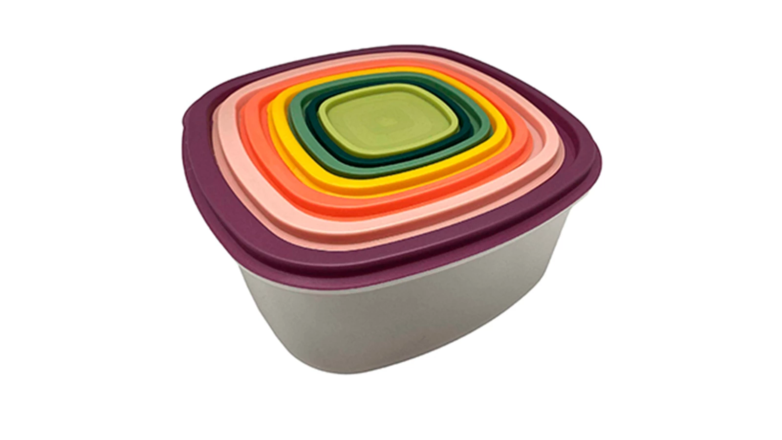 Para famílias grandes, o conjunto de sete caixas herméticas de plástico é ideal. Com capacidades que variam de 200 ml a 5 litros, estas caixas permitem guardar diferentes alimentos, como saladas, frutas e bolachas. Assim, evita a mistura de sabores e odores.