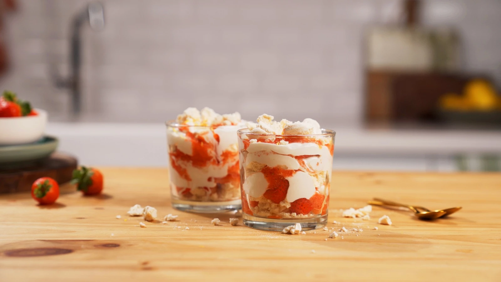 Um toque britânico que combina morangos bem frescos, chantilly e pedaços crocantes de merengue.