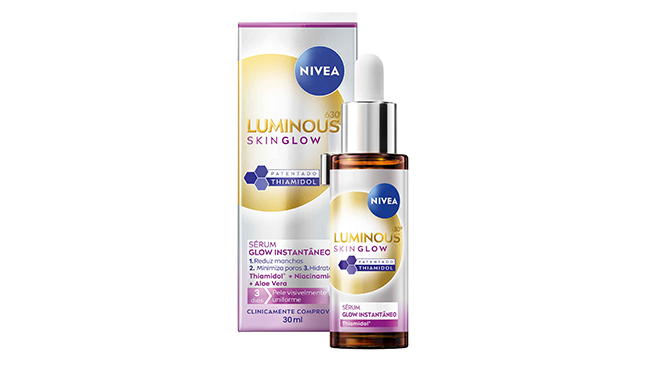 O Sérum de Rosto Luminous 630 Skin Glow da Nivea combina o ingrediente patenteado Thiamidol® - eficaz no combate às manchas escuras - com niacinamida e aloé vera, que ajudam a hidratar e a minimizar os poros. A sua fórmula torna a pele mais luminosa e uniforme em apenas duas semanas.
