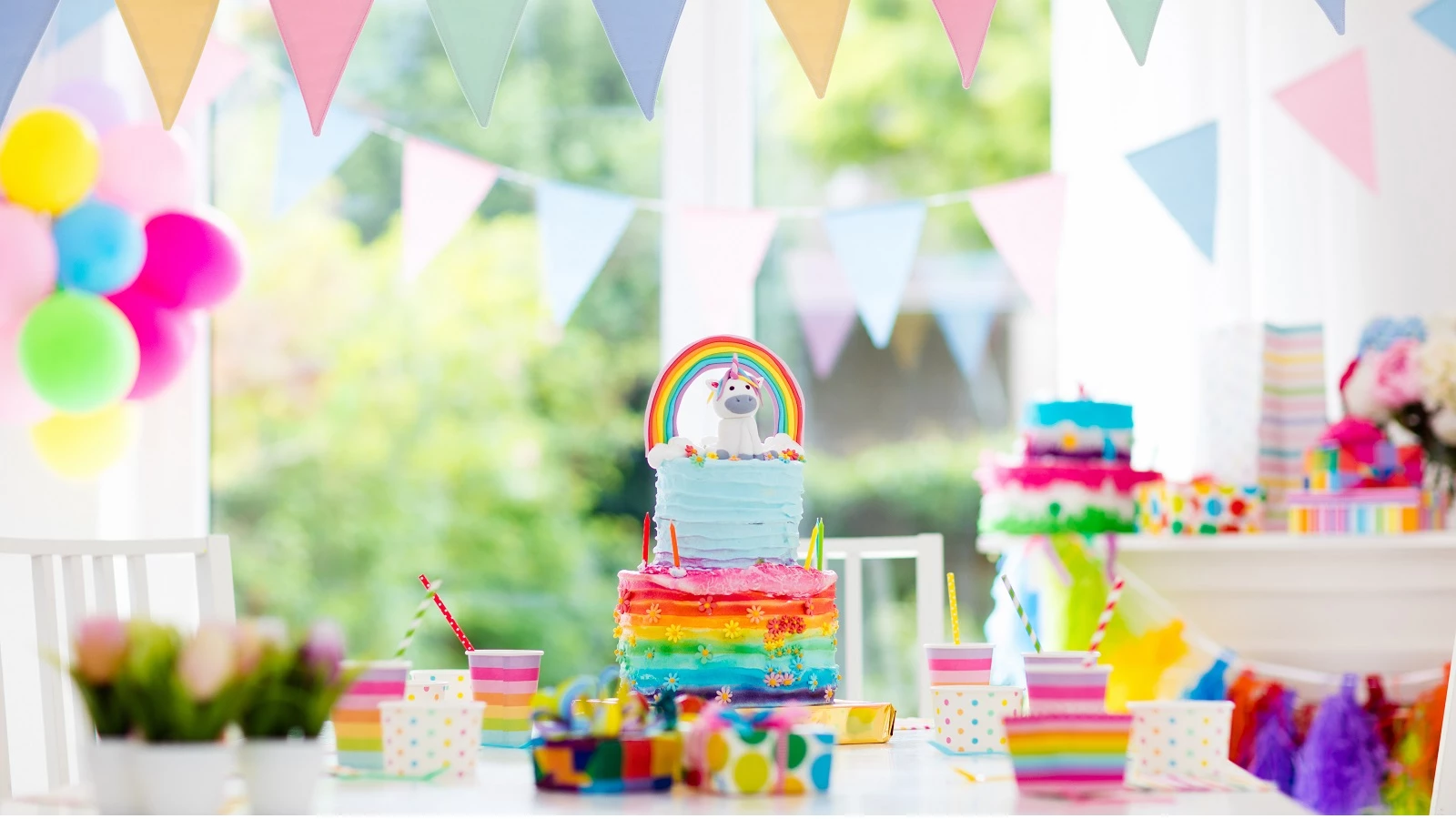 Atrás da mesa do bolo pode colocar um painel e decorá-lo de várias formas. Seja com grinaldas de parabéns, letras com o nome ou balões com a idade do aniversariante, plantas ou flores.