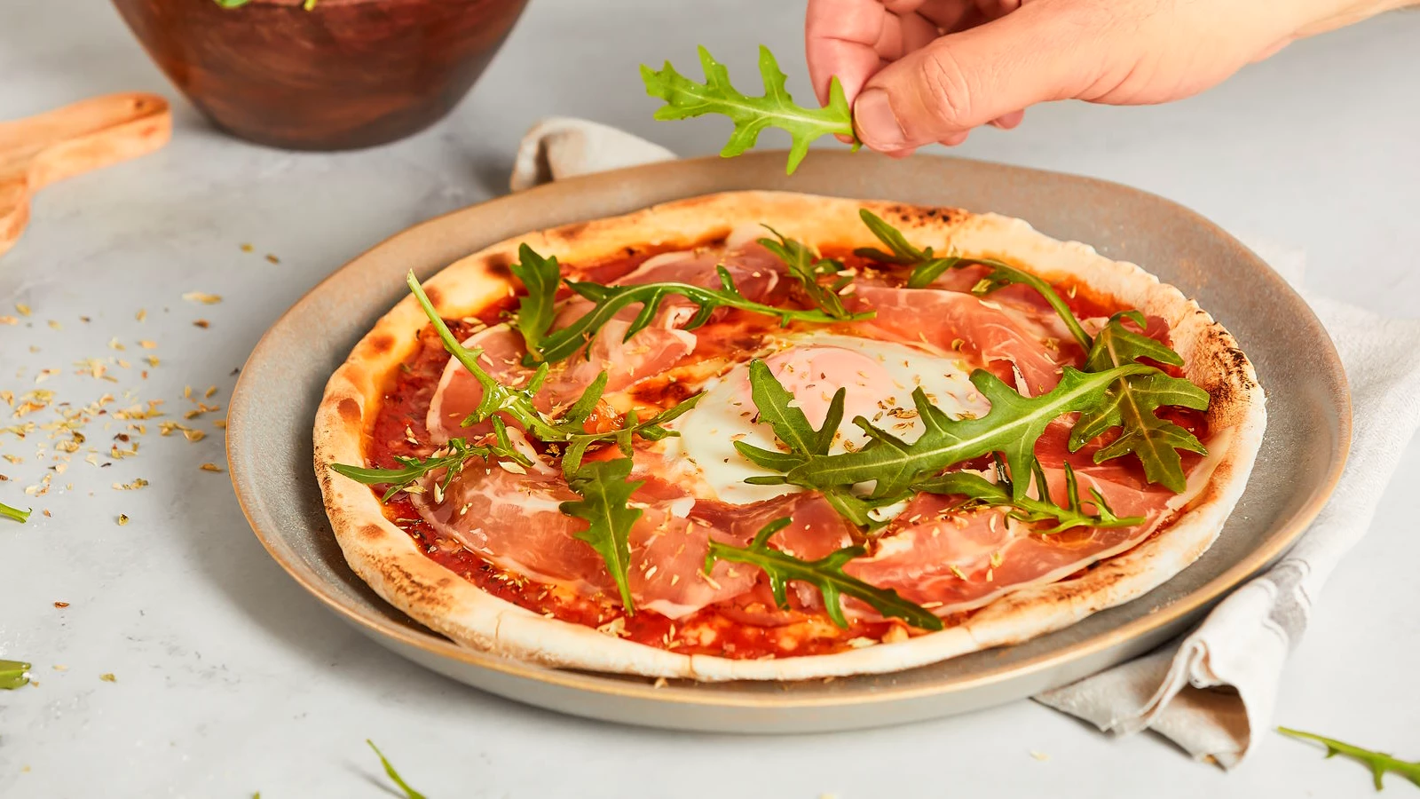 Mozzarella Fior di Latte , Presunto, Ovo e Rúcula