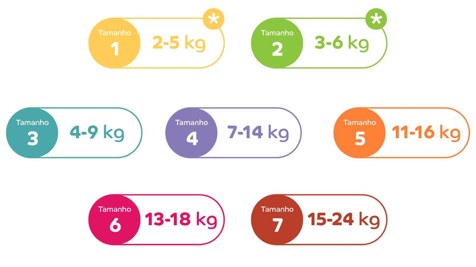 Os tamanhos T1 e T2 estão disponíveis apenas nas Fraldas Suavidade, enquanto os tamanhos T3 a T7 estão disponíveis nas Fraldas Movimento e Absorção.