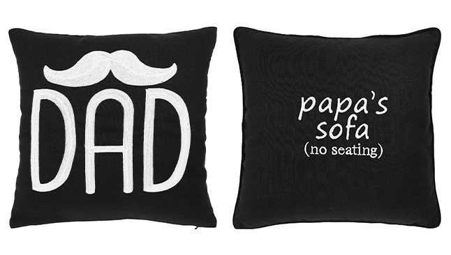 Para contrariar o cansaço, tão comum nos primeiros meses enquanto pai, pense em oferecer uma almofada especial, como esta preta com bordado em branco, perfeita para os pais com bigode. Outra opção é esta almofada com uma mensagem divertida: “papa’s sofa (no seating)” – que, em português, é qualquer coisa como “sofá do papá, ninguém se senta!”.