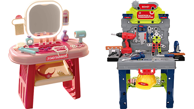 - Bancada Ferramentas Faz de Conta: ideal para as crianças que adoram ajudar em casa e colocar mãos à obra. Esta bancada completa vem com várias ferramentas e acessórios para construir, reparar e inventar o que a imaginação mandar.