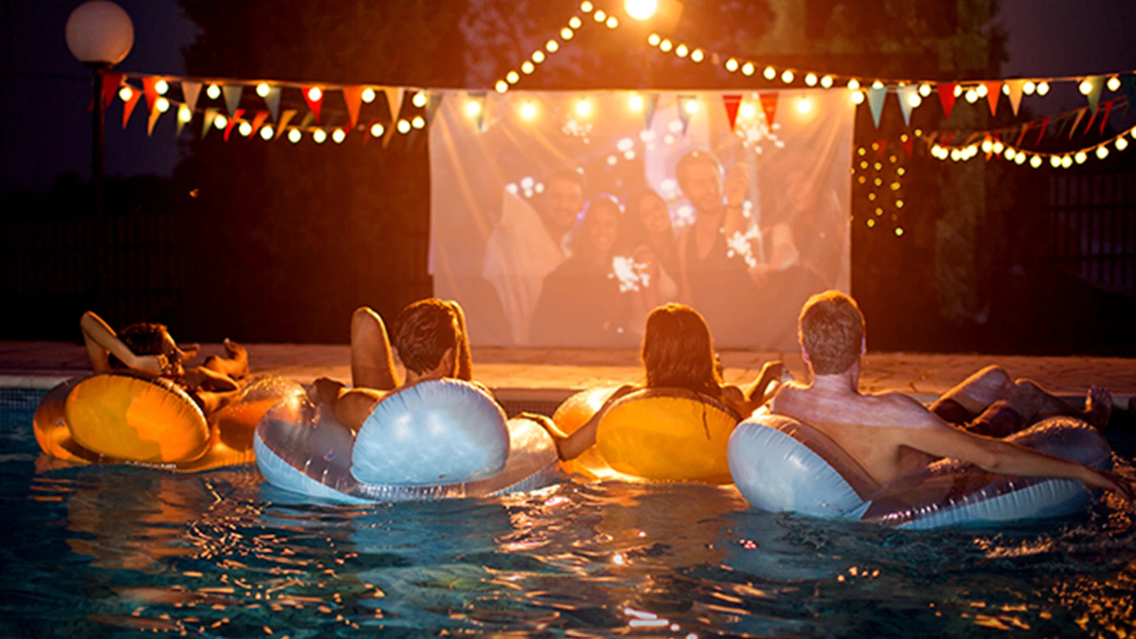 Já imaginou poder desfrutar de uma bela tarde de cinema em cima de um colchão insuflável a flutuar na sua piscina? Com a ajuda de uma tela e de um projetor é possível fazer uma maratona de filmes com todos os seus amigos a verem e a desfrutarem dentro de água. Pode ainda usar uma toalha branca para servir de tela. E não se esqueça: tem de haver pipocas.