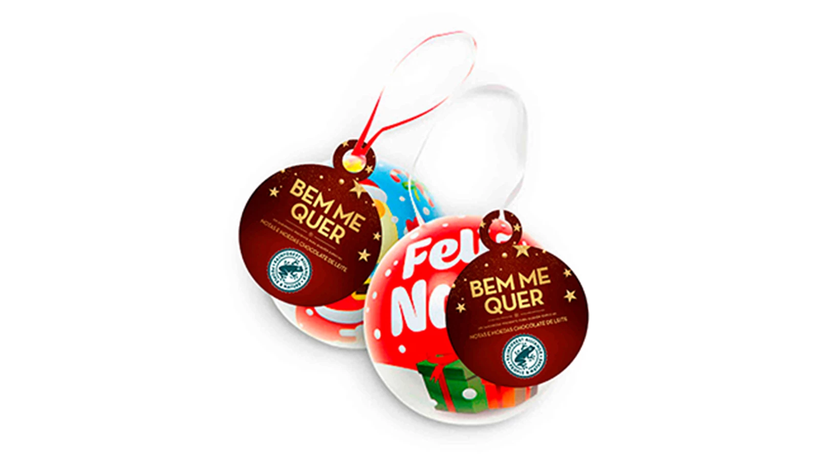 Para os mais pequenos que adoram chocolate, a marca Bem Me Quer apresenta notas e moedas de chocolate de leite na versão em rede ou bola decorativa.