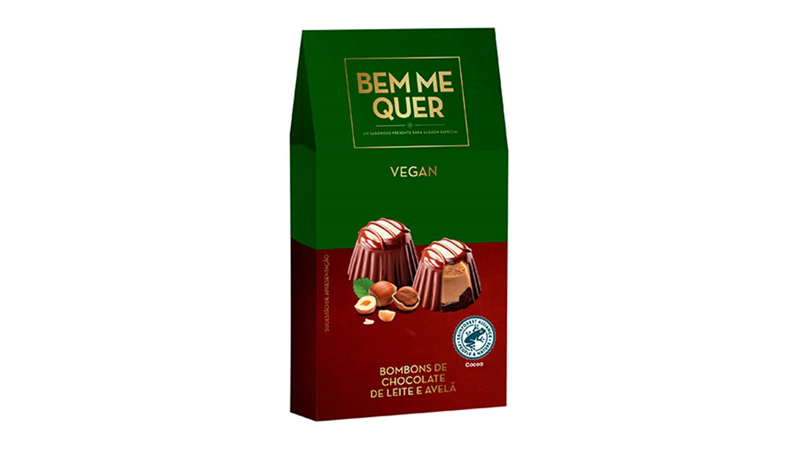 Dentro da marca Bem Me Quer, também há opções vegan, como estes deliciosos bombons de chocolate de leite com recheio cremoso de avelã.
