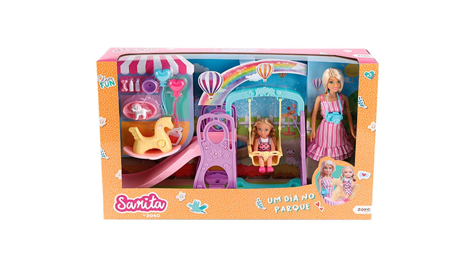 Para as crianças que gostam de brincar com bonecas, a Sarita no Parque é uma ótima prenda. Inclui a sua boneca preferida, com um bebé, um baloiço e muitos mais acessórios.