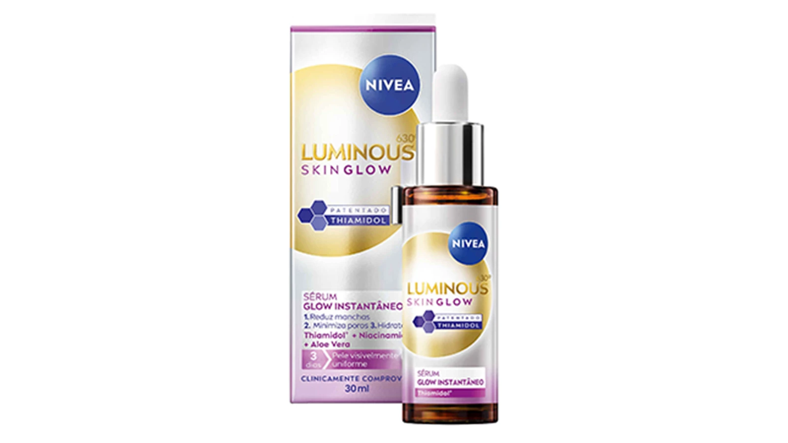 O Sérum de Rosto Luminous 630 Skin Glow da Nivea combina o ingrediente patenteado Thiamidol® - eficaz no combate às manchas escuras - com niacinamida e aloé vera, que ajudam a hidratar e a minimizar os poros. A sua fórmula torna a pele mais luminosa e uniforme em apenas duas semanas.