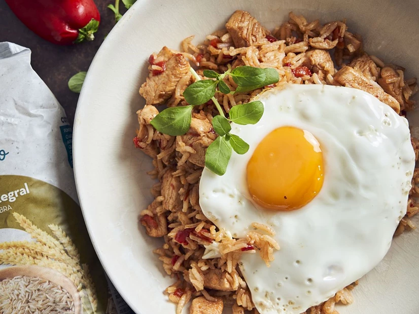 Adicione ovos estrelados ao arroz frito com frango e decore com manjericão.