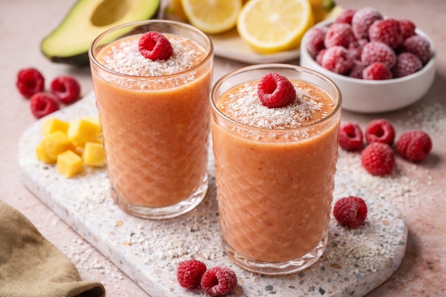 Para fazer esta receita de batido saudável basta adicionar água, o abacate, o sumo de limão, a manga e as framboesas no liquidificador.