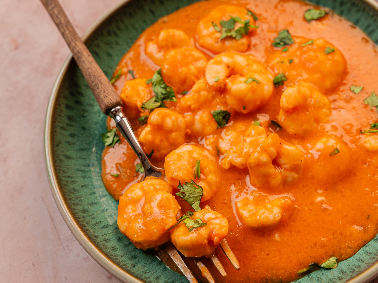 Junte os camarões marinados e a polpa de tomate, misture e deixe cozinhar por 5 minutos.