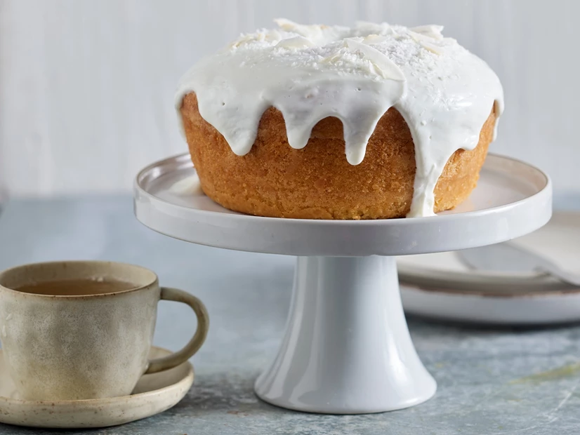 Deixe arrefecer, desenforme o bolo e cubra-o com iogurte grego e coco ralado.