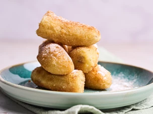 Para caramelizar as peras, lave-as e descasque-as, corte-as fininhas e deixe a macerar em sumo de limão e açúcar mascavado.