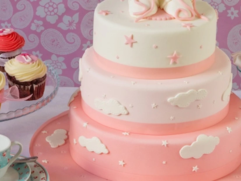Recheie o bolo com a ganaché de chocolate. Cubra com pasta de açúcar que deve adquirir nas lojas da especialidade. Nota: Para fazer um bolo com 3 andares multiplique cada um dos ingredientes por dois e distribua a massa por 3 formas sem buraco e de diferentes diâmetros.