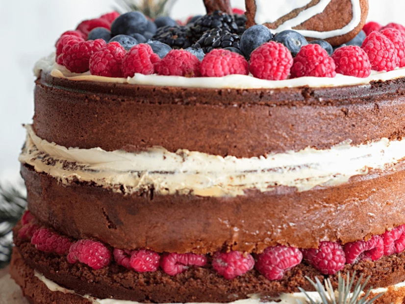 Decore o seu bolo floresta negra com frutos vermelhos e bolachas de gengibre com formas de animais, e sirva-o de seguida.