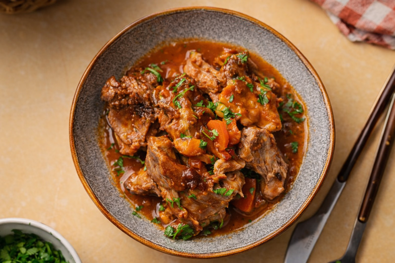 Coloque o cabrito sobre as batatas e regue com a marinada.