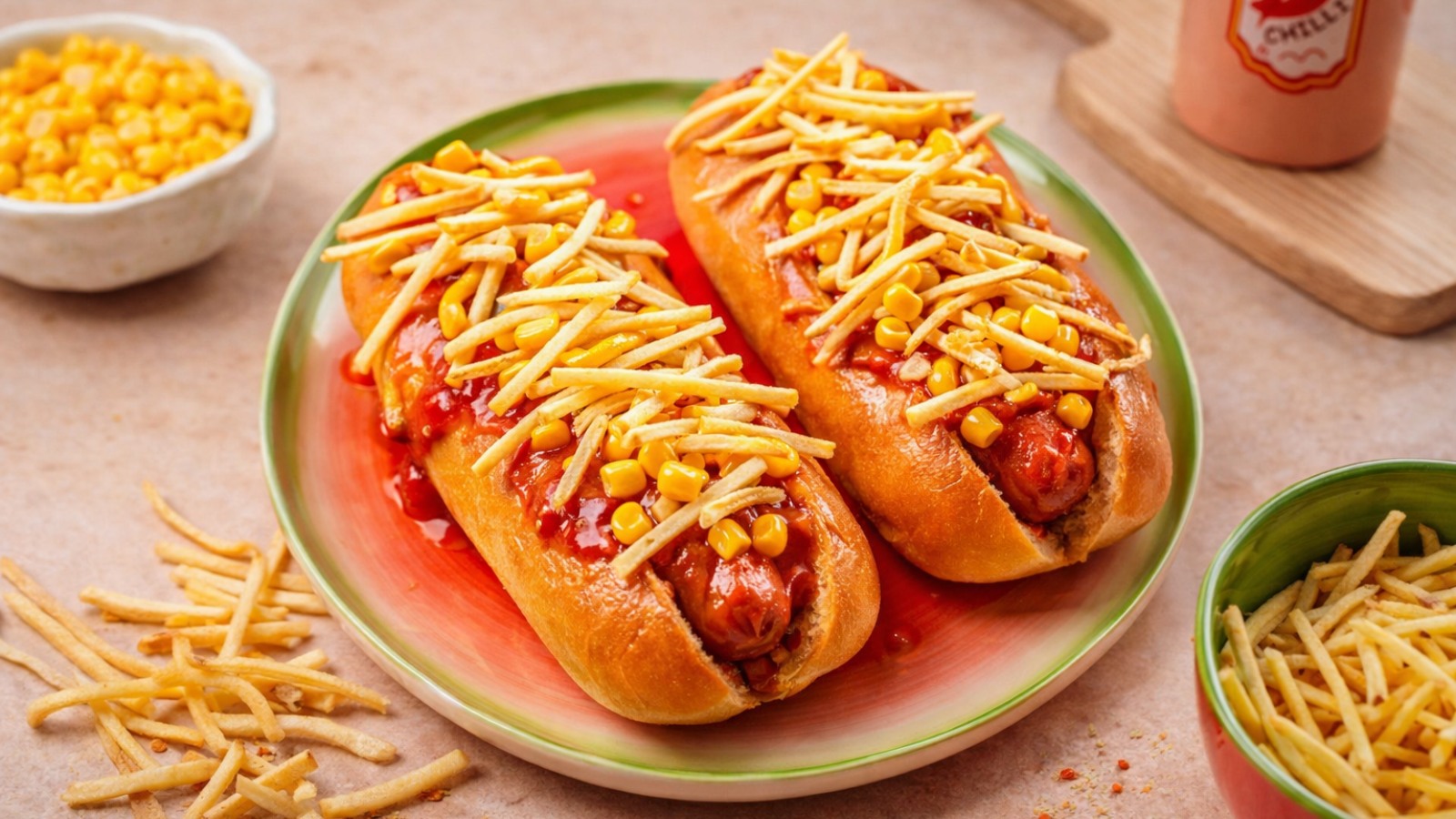 Sirva o pão de cachorro com o a salsicha cozida e decore com molho de mostarda, batata frita, milho e o molho de tomate.