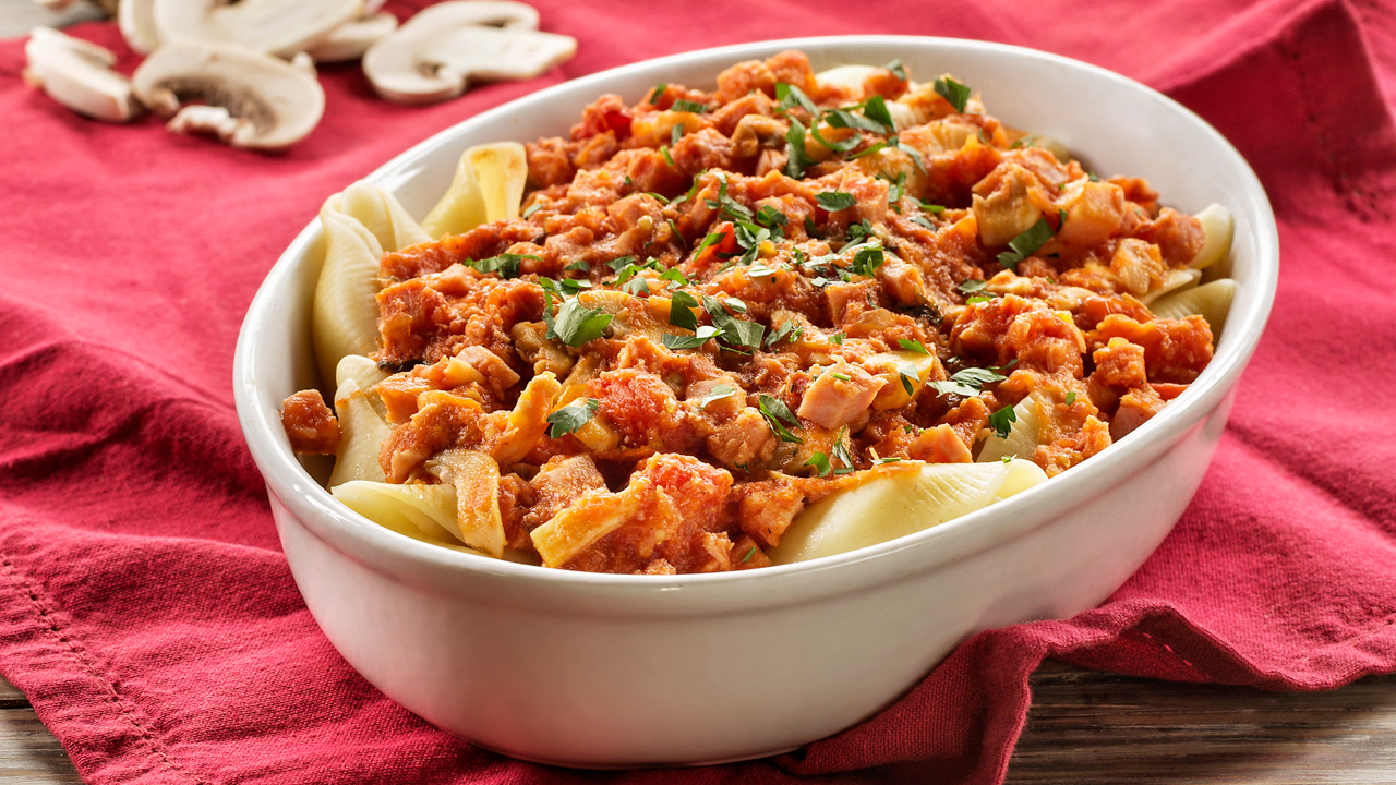 Recheie os canelones com o preparado de veggie meal e disponha por cima da polpa.