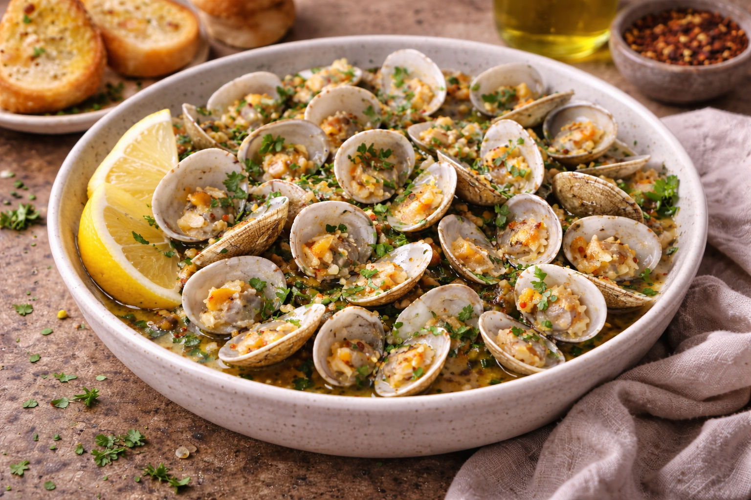 A meio da cozedura junte os mexilhões, o camarão inteiro e o tamboril. Disponha um molho de coentros por cima da cataplana de marisco tape e deixa cozinhar por 15 a 20 minutos.
