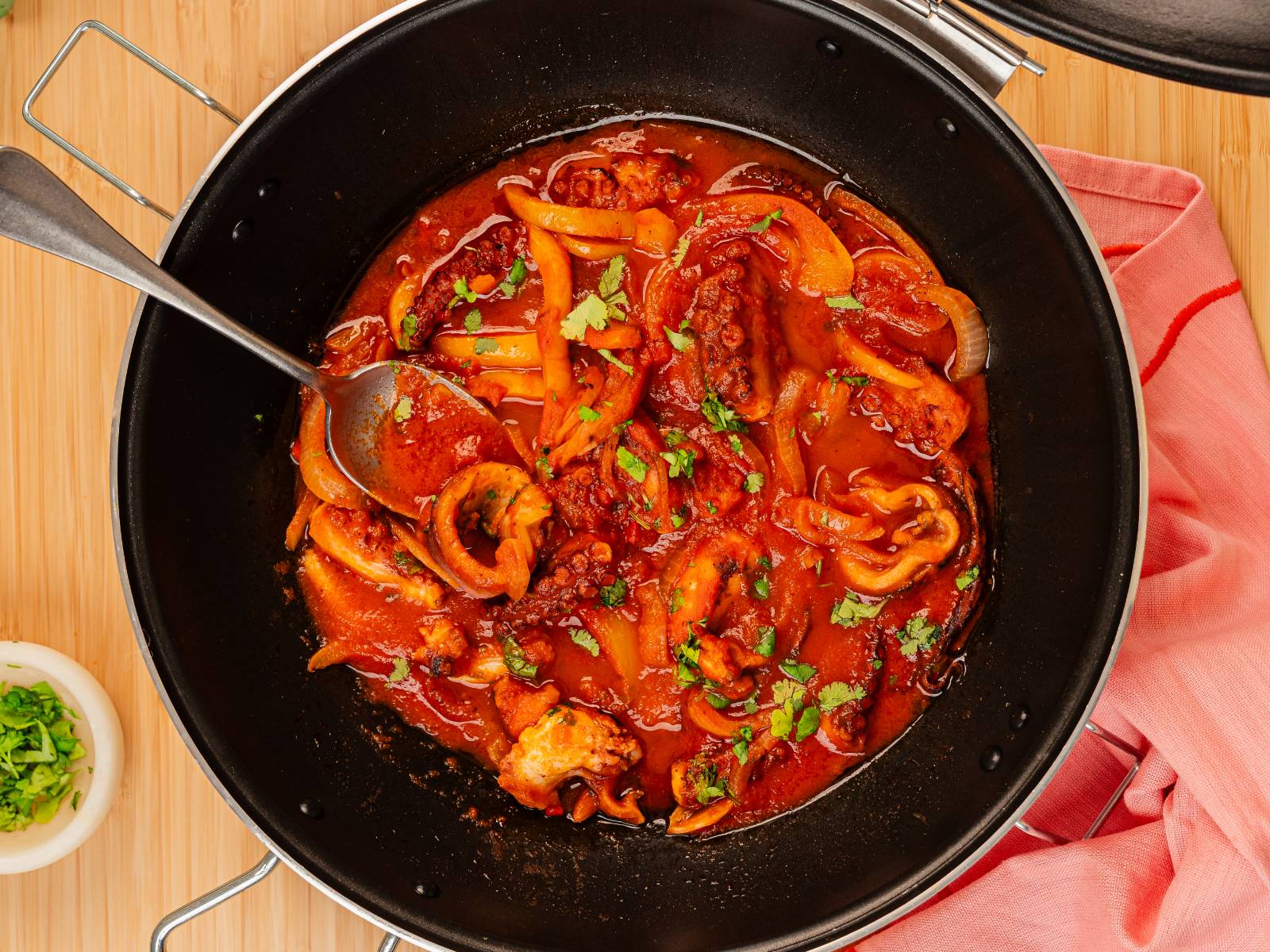 Junte o polvo cortado em pedaços, envolva cuidadosamente e deixe cozinhar em lume brando entre 20 e 30 minutos, para que o molho apure.