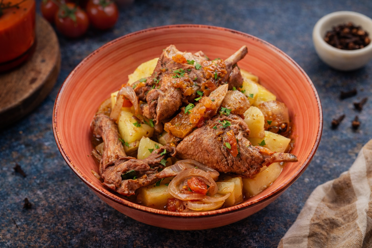 Comece por colocar num tacho um fio de azeite, o tomate sem pele cortado em pequenos pedaços, a cebola picada, o pimento cortado em pedaços, os alhos picados e os lombinhos de coelho. Tempere com um pouco de sal e pimenta, junte a massa de pimentão, o vinho branco e a água. Mexa, tape o tacho e leve a lume brando cerca de 50 minutos, mexendo de vez em quando.