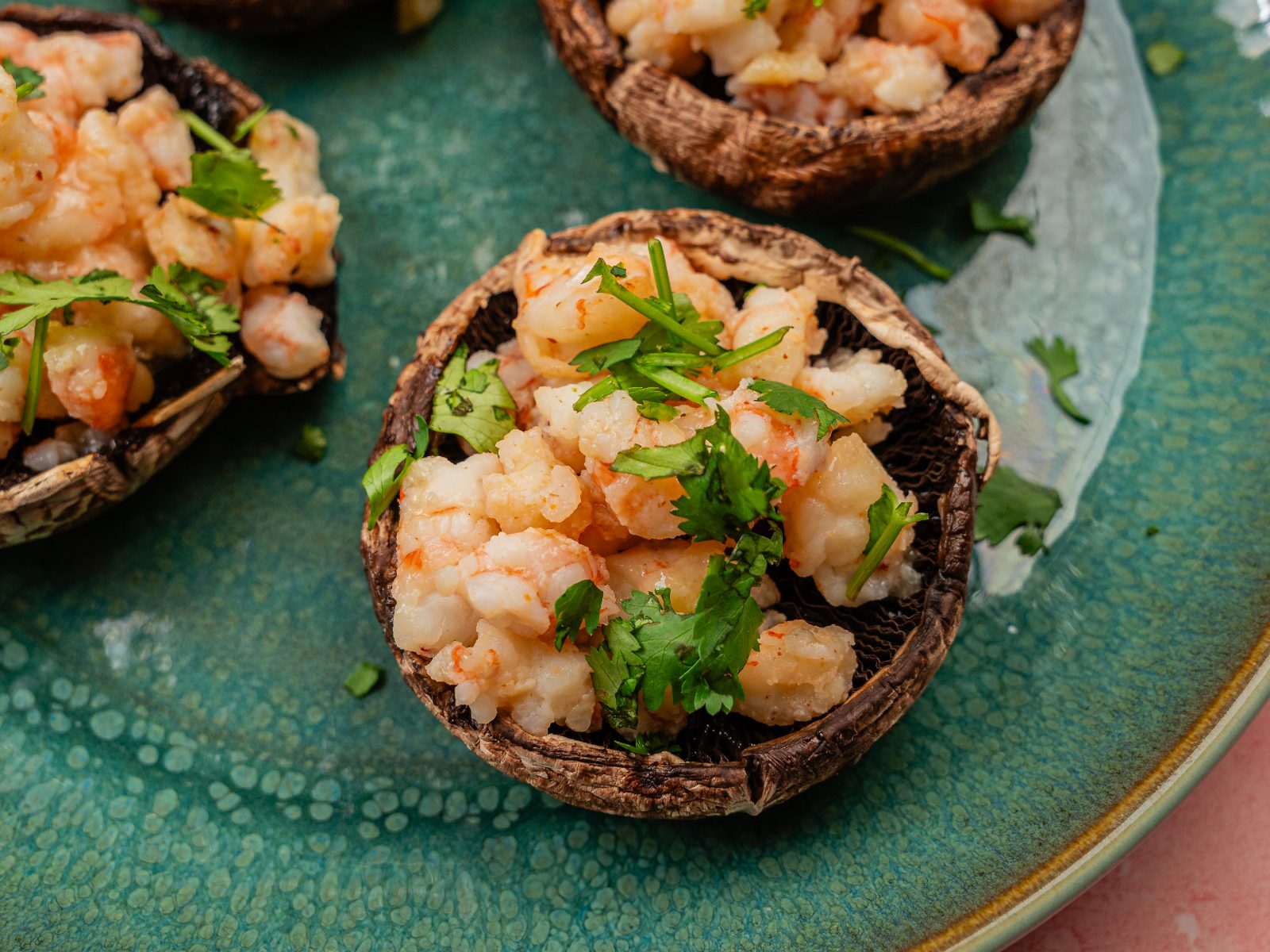 Recheiam-se os cogumelos com as gambas e polvilham-se com coentros finamente picados.