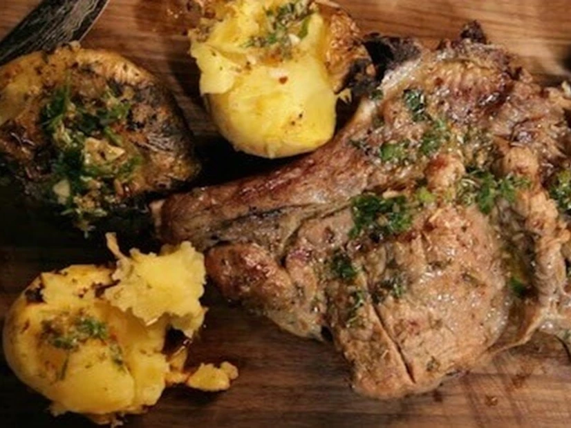 Temperar as costeletas de vitela com sal grosso dos dois lados, mariná-las no chimichurri e colocar a carne na grelha. Entretanto, esmagar as batatas (já cozidas) e colocá-las na grelha, quando estiverem douradas pincelar com um pouco da marinada de chimichurri.