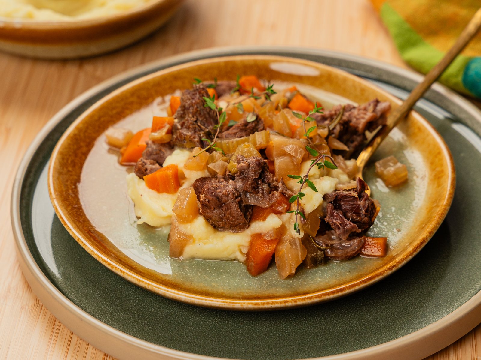 Disponha numa travessa, alise a superfície e cubra com puré de batata. Alise novamente, pincele com gema de ovo batida e faça desenhos com um garfo. Leve ao forno a 180ºC por 15 a 20 minutos ou até dourar.