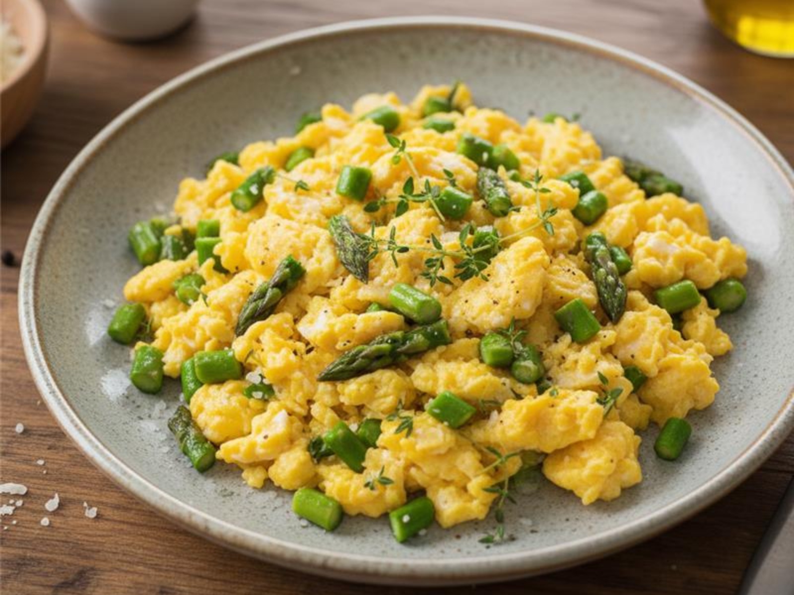 Usando uma espátula, comece a mexer os ovos suavemente, juntando os espargos enquanto eles cozinham. Continue a mexer até os ovos estarem no ponto desejado (cremosos ou mais secos), geralmente por 1 a 2 minutos.