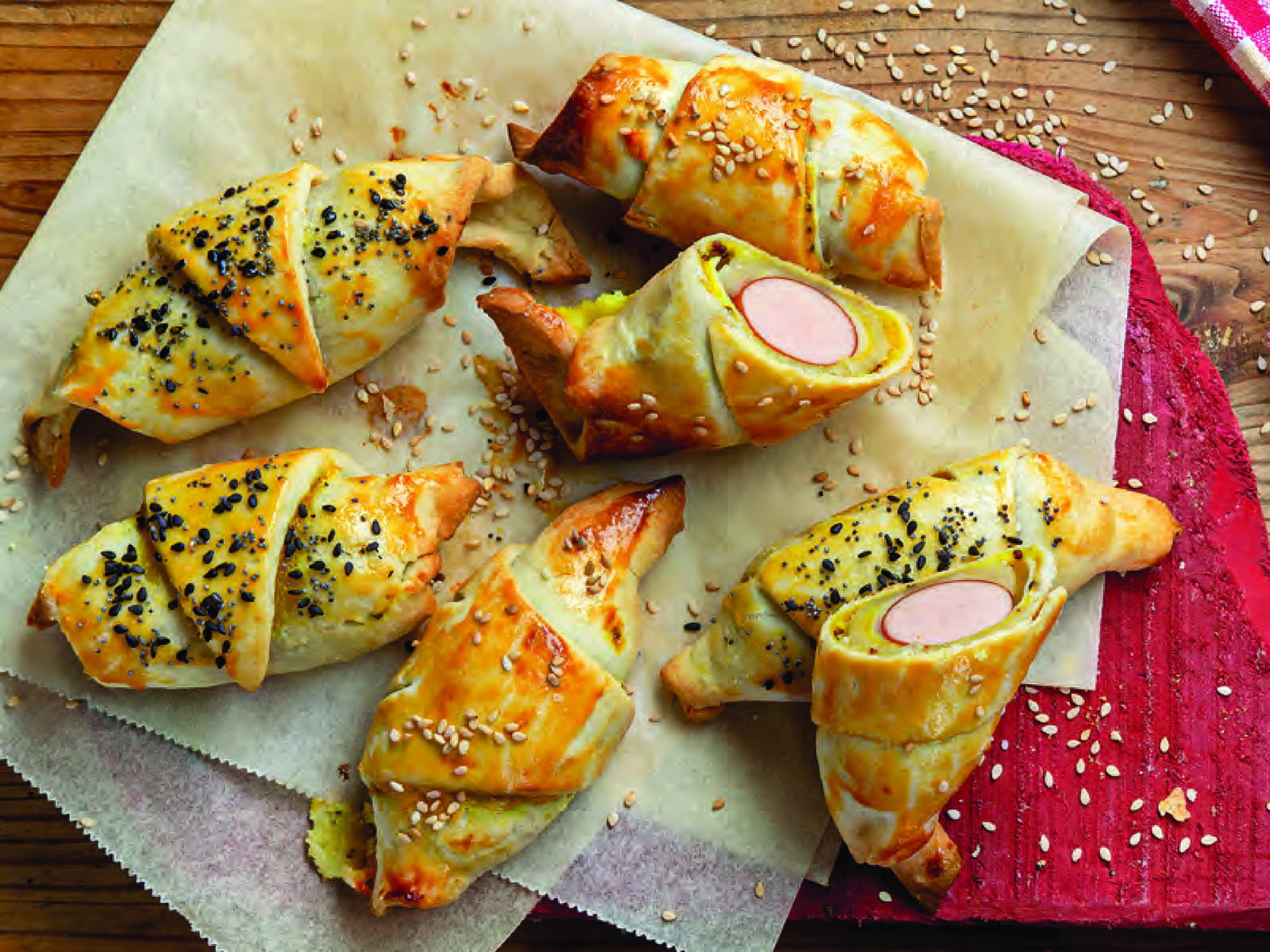Pincele uma das bordas da massa com gema de ovo batida e disponha o recheio de salsicha no centro.