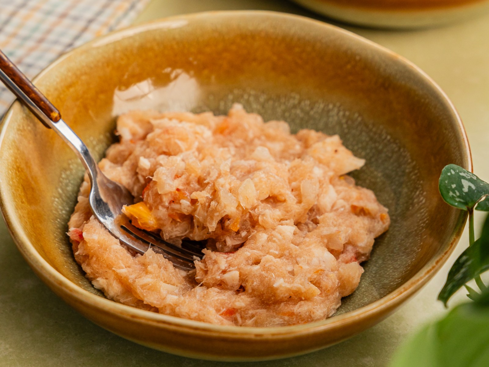 Num processador de alimentos, comece por picar o pão, o manjericão, um dente de alho, sal e pimenta a gosto, e o queijo. Coloque o preparado num prato.