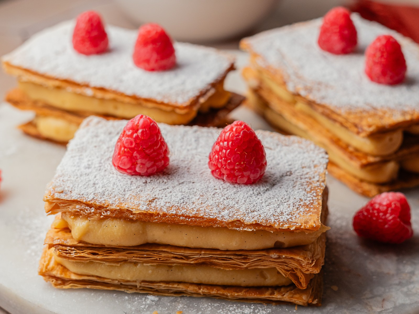 Assim que terminado o recheio, para a montagem, coloque sobre um retângulo de massa folhada o recheio e framboesas e finalize com outro retângulo de massa folhada.