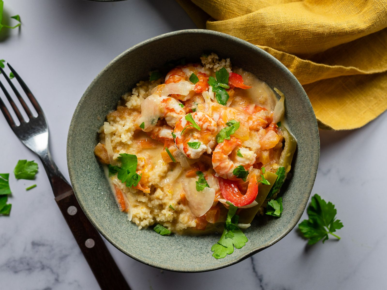 Comece por preparar os camarões, descascando-os. Coloque-os numa taça tempere com sal e pimenta, regue com sumo de 1 limão e deixe marinar por 20 minutos.