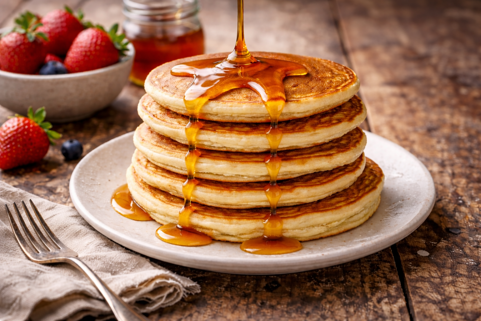 Aqueça uma frigideira anti-aderente em lume médio e unte com manteiga. Quando estiver quente, para cada panqueca, coloque 3 colheres de sopa da massa. (Nota: com esta quantidade, serve 6 panquecas.)