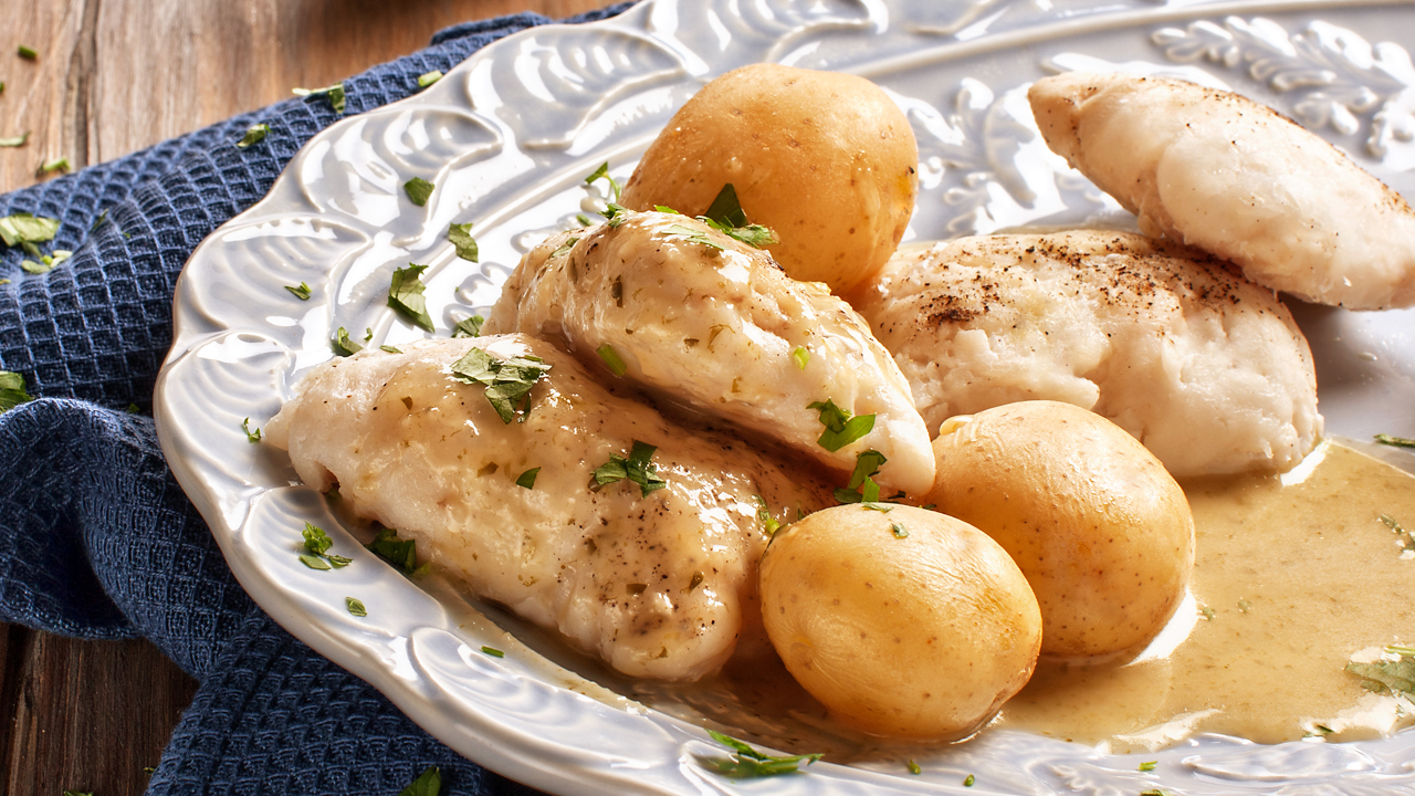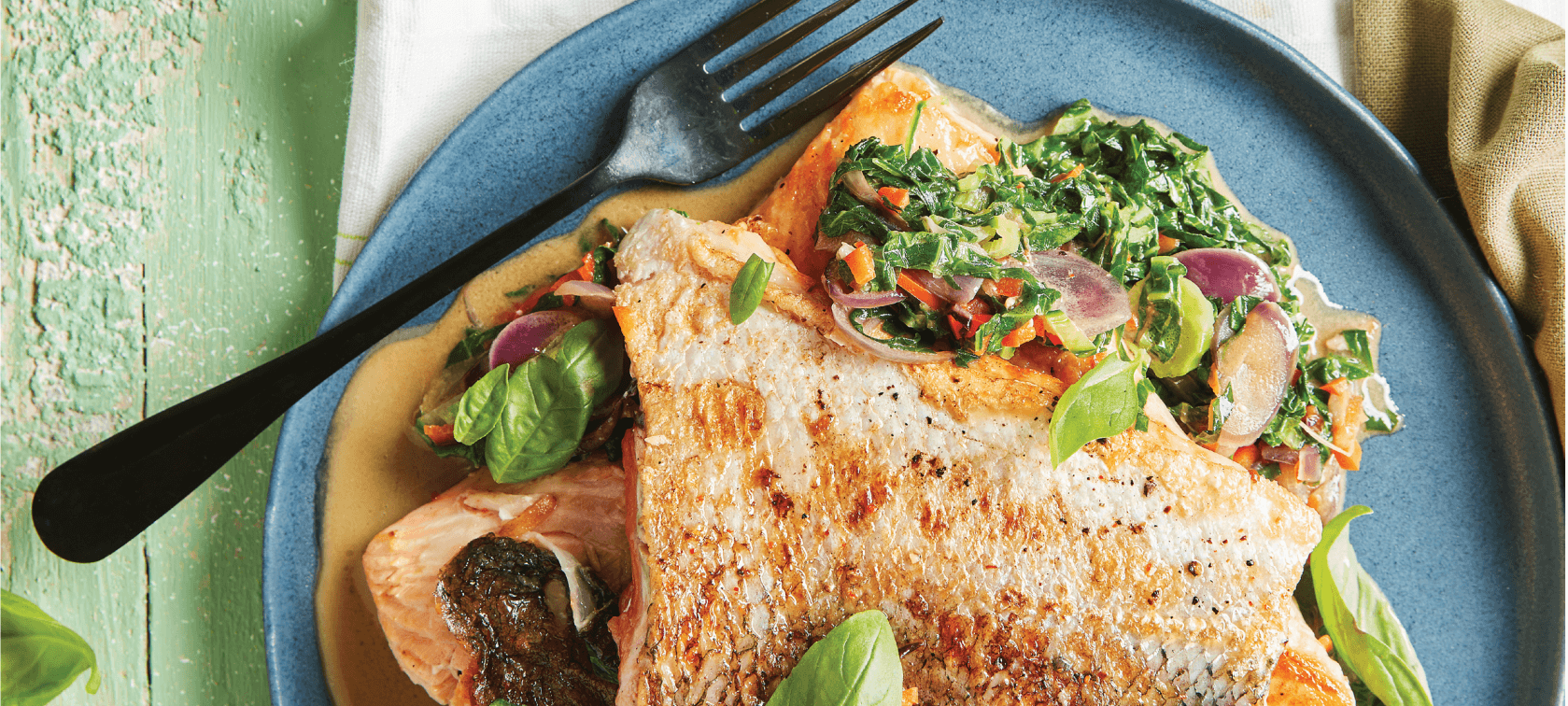 Sirva o pargo juntamente com as batatas e a curgete e finalize decorando com tomilho e alecrim a gosto.