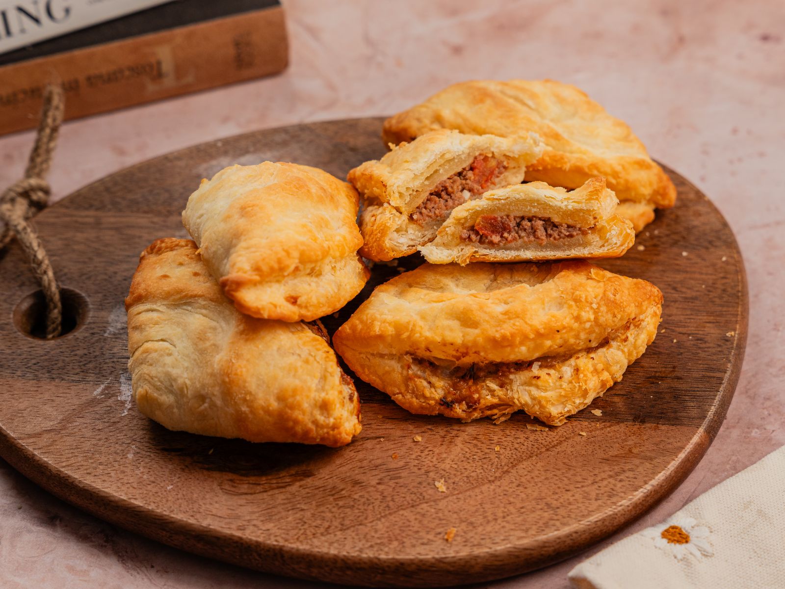 Recheie os discos de massa com a mistura de carne (1 colher de sopa por pastel) e feche os discos de massa formando meias-luas.
