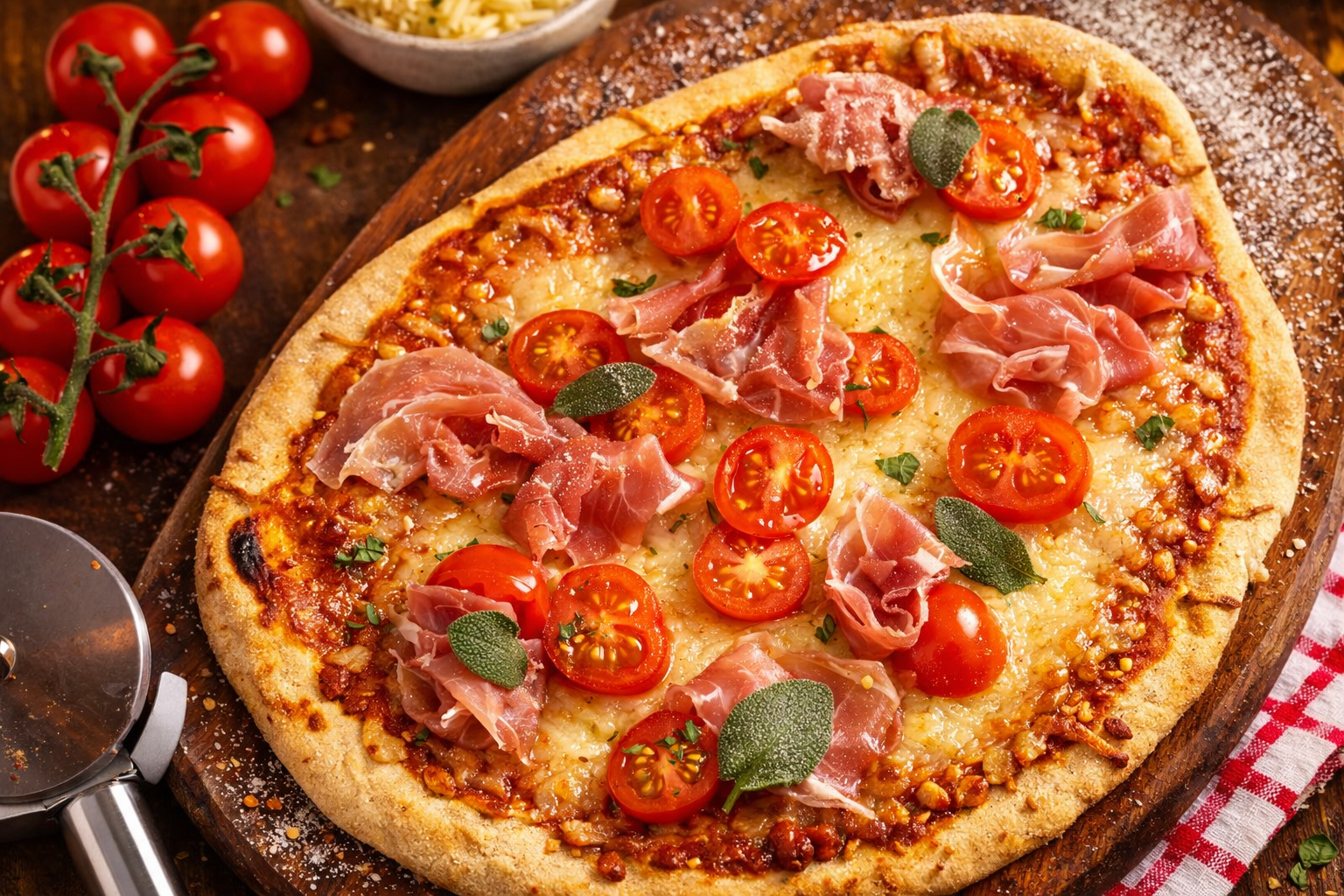 Descubra como preparar uma deliciosa Pizza de Aveia com Mozarela, Presunto de Parma e Tomates Cherry em apenas 20 minutos.
