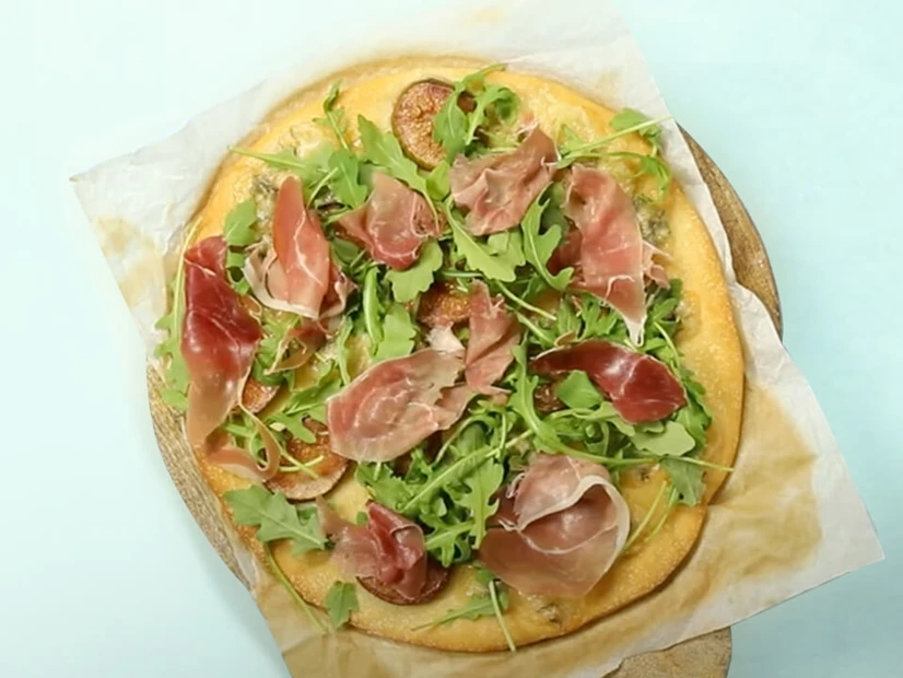 Retire do forno e coloque as fatias de presunto e polvilhe com as folhas de rúcula. Regue com um fio de azeite e um fio de creme balsâmico.