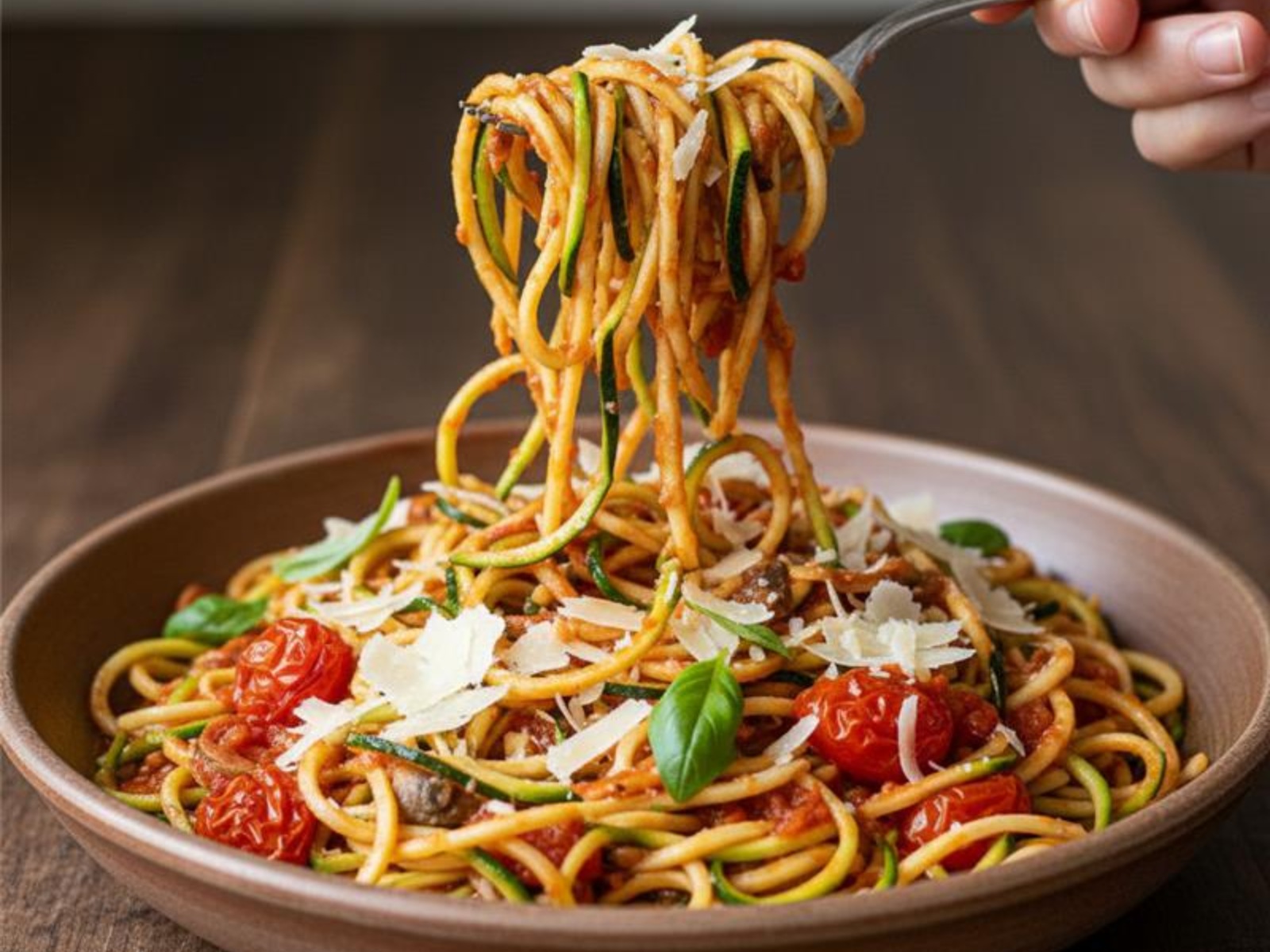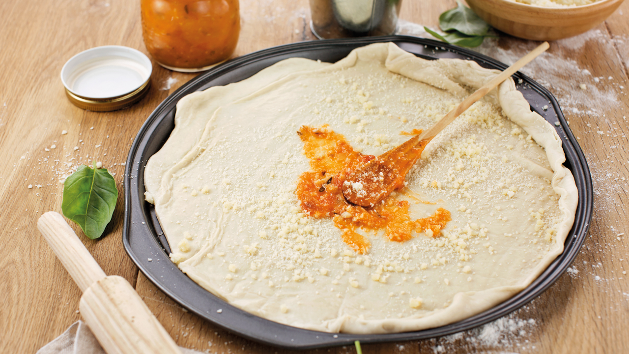 Estender a massa sobre uma folha de papel vegetal. Espalhar a polpa de tomate, dispor os cogumelos previamente salteados, o tomate cereja em metades e por fim as fatias de mozzarella. Polvilhar com orégãos e levar ao forno a 200ºC por 15 a 20 minutos.