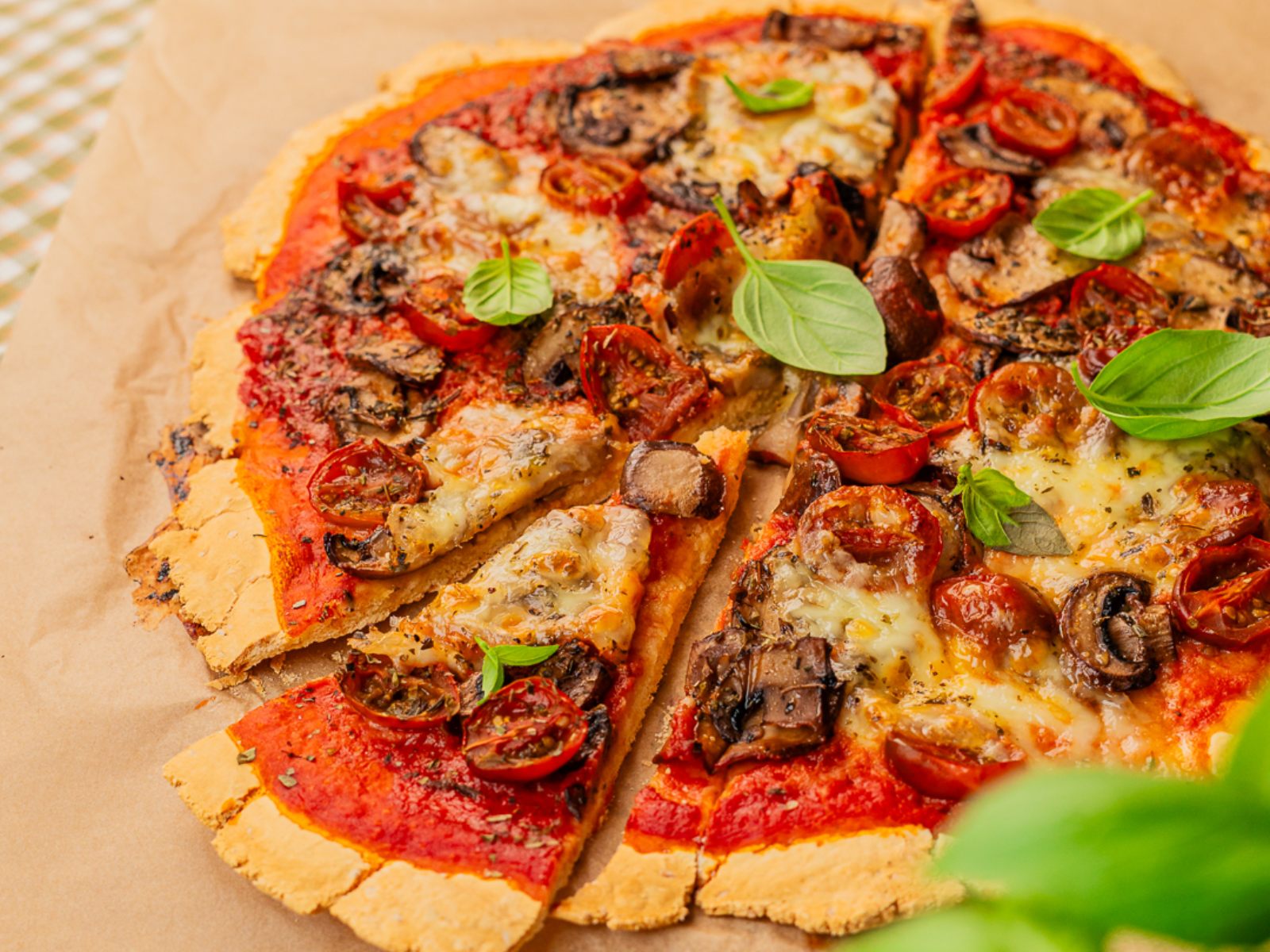 Servir a pizza sem glúten e decorar com manjericão fresco.