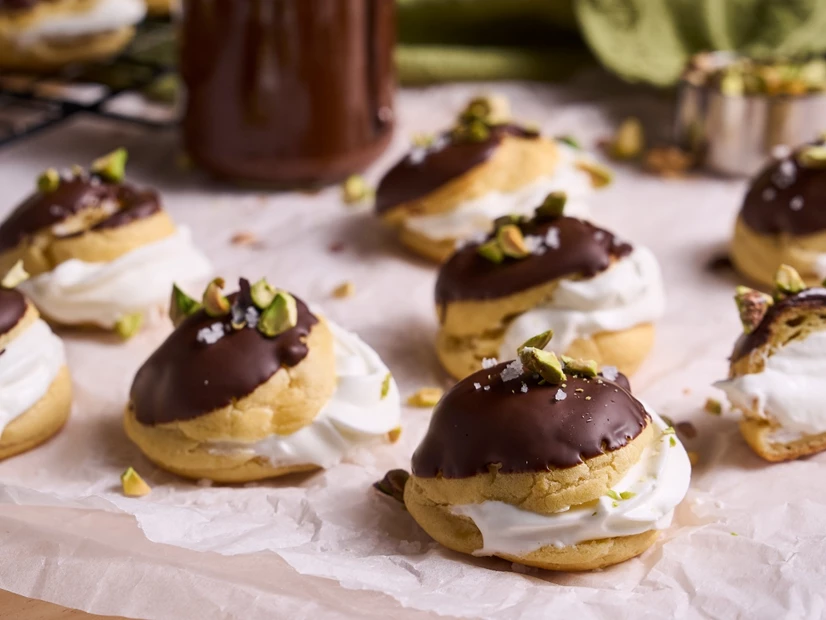 Passar cada profiterole pelo chocolate, dispor num prato e polvilhar com os pistácios grosseiramente picados.