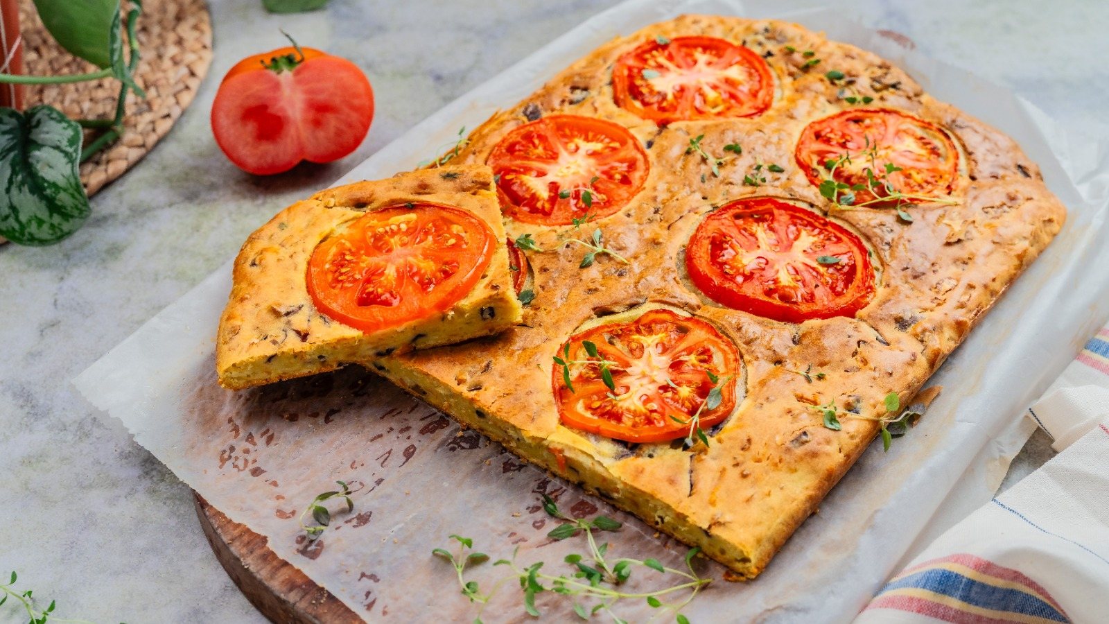 Bata os ovos, a bebida vegetal de aveia e as natas com um pouco de pimenta e despeje na forma. Junte o resto do tomate e cebolinha e pedaços de queijo cheddar. Leve ao forno por cerca de 25 minutos ou até que esteja dourado.
