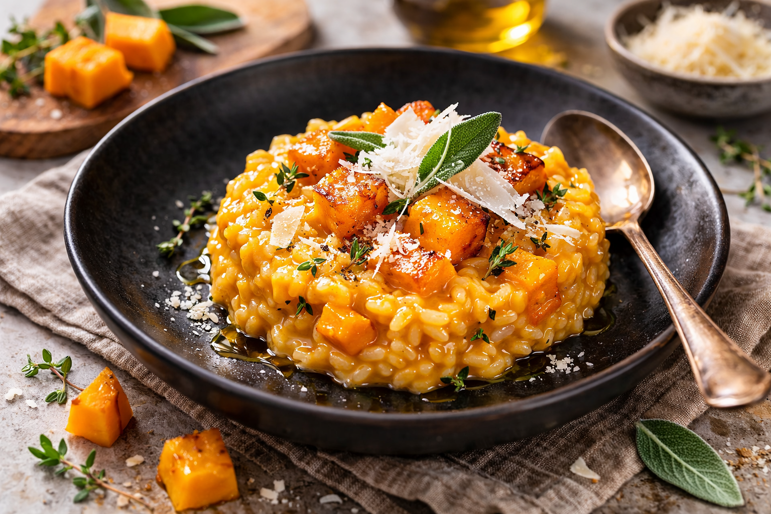 Sirva o risoto dispondo os pedaços de abóbora assada por cima e decore com lascas de parmesão.